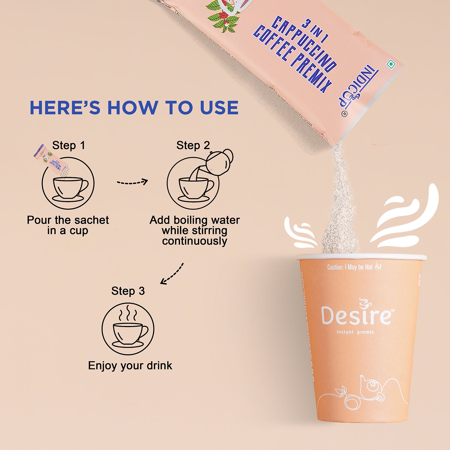 For Manual Use: follow the easy 3 steps Empty 1 Sachet Premix In One Cup. Fill the cup with hot water (not boiling) and keep stirring all the time.
